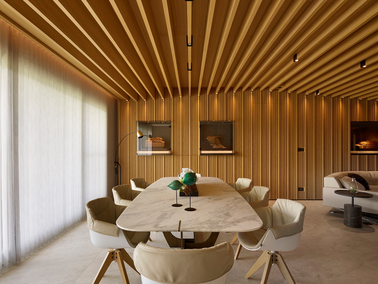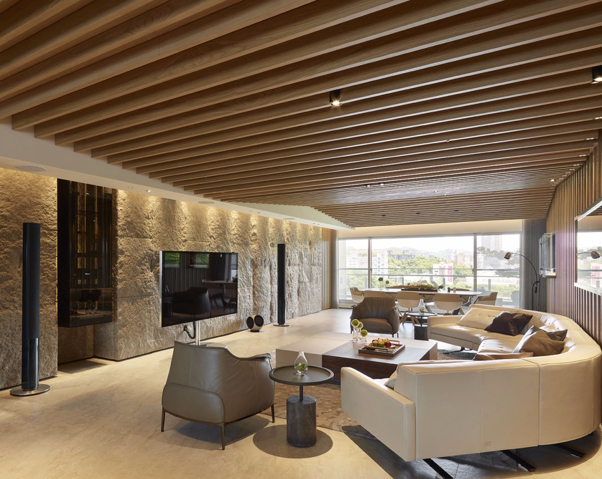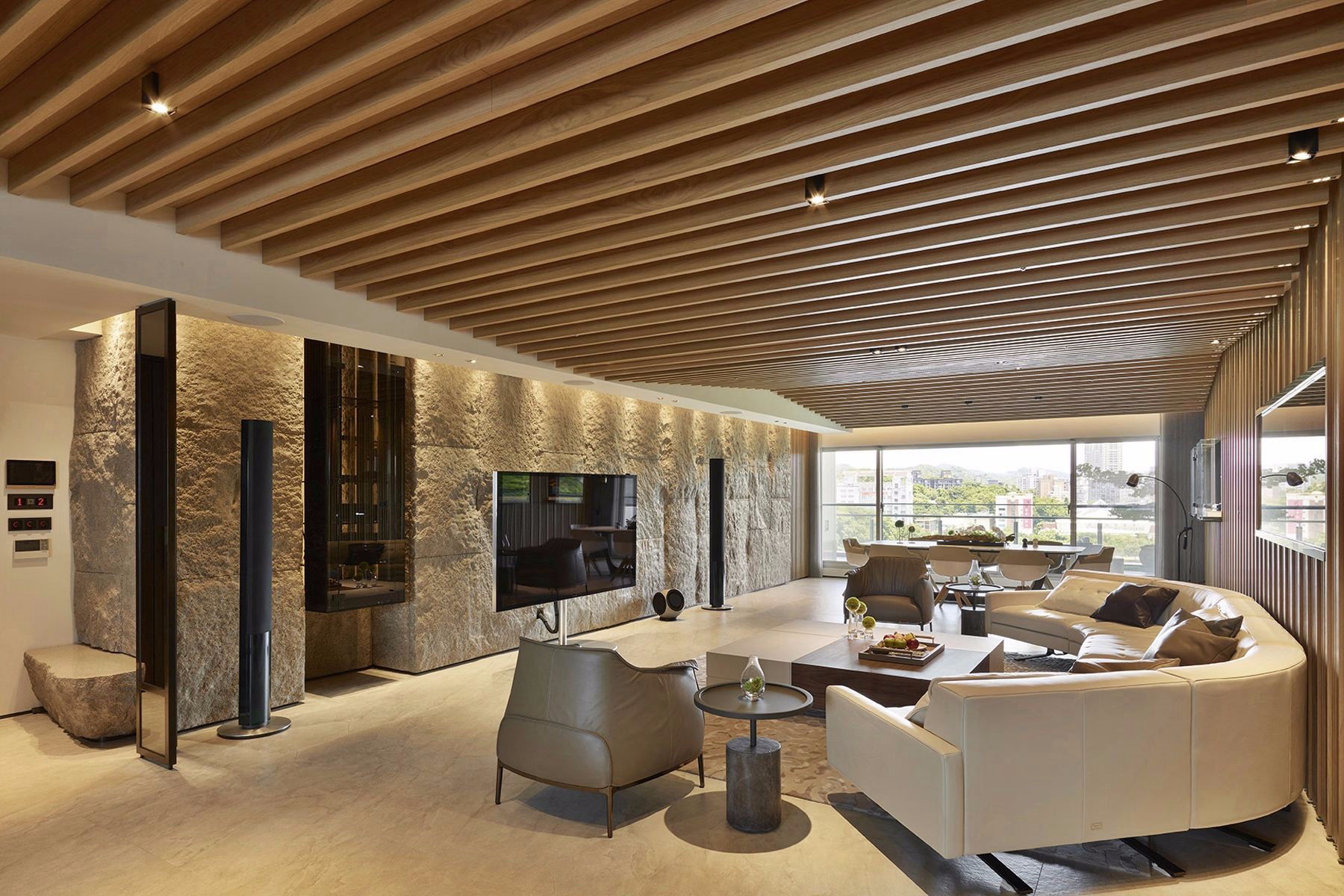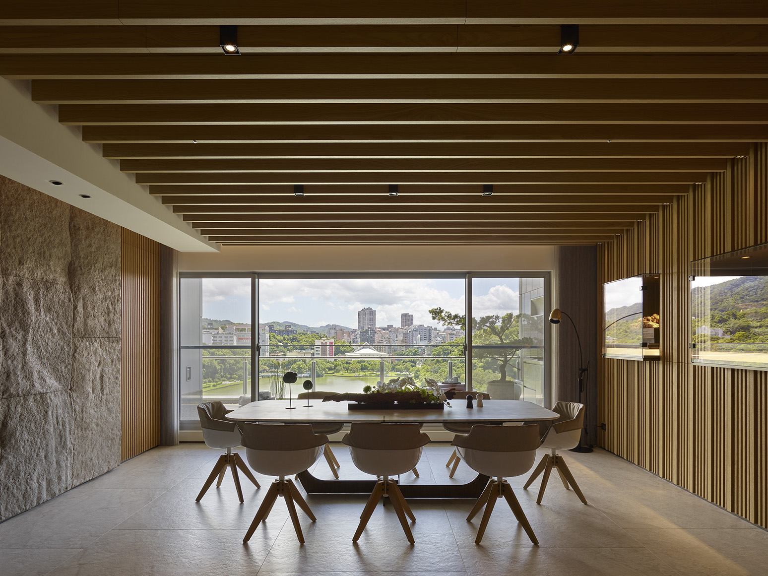 以水波紋的概念規劃出格柵的高低變化,藉由此變化將客廳的大樑消除於無形,也將碧湖的水引入空間.........。