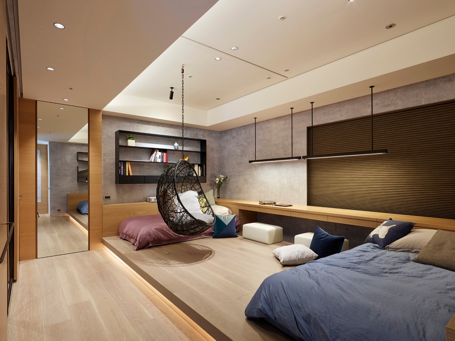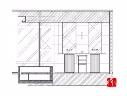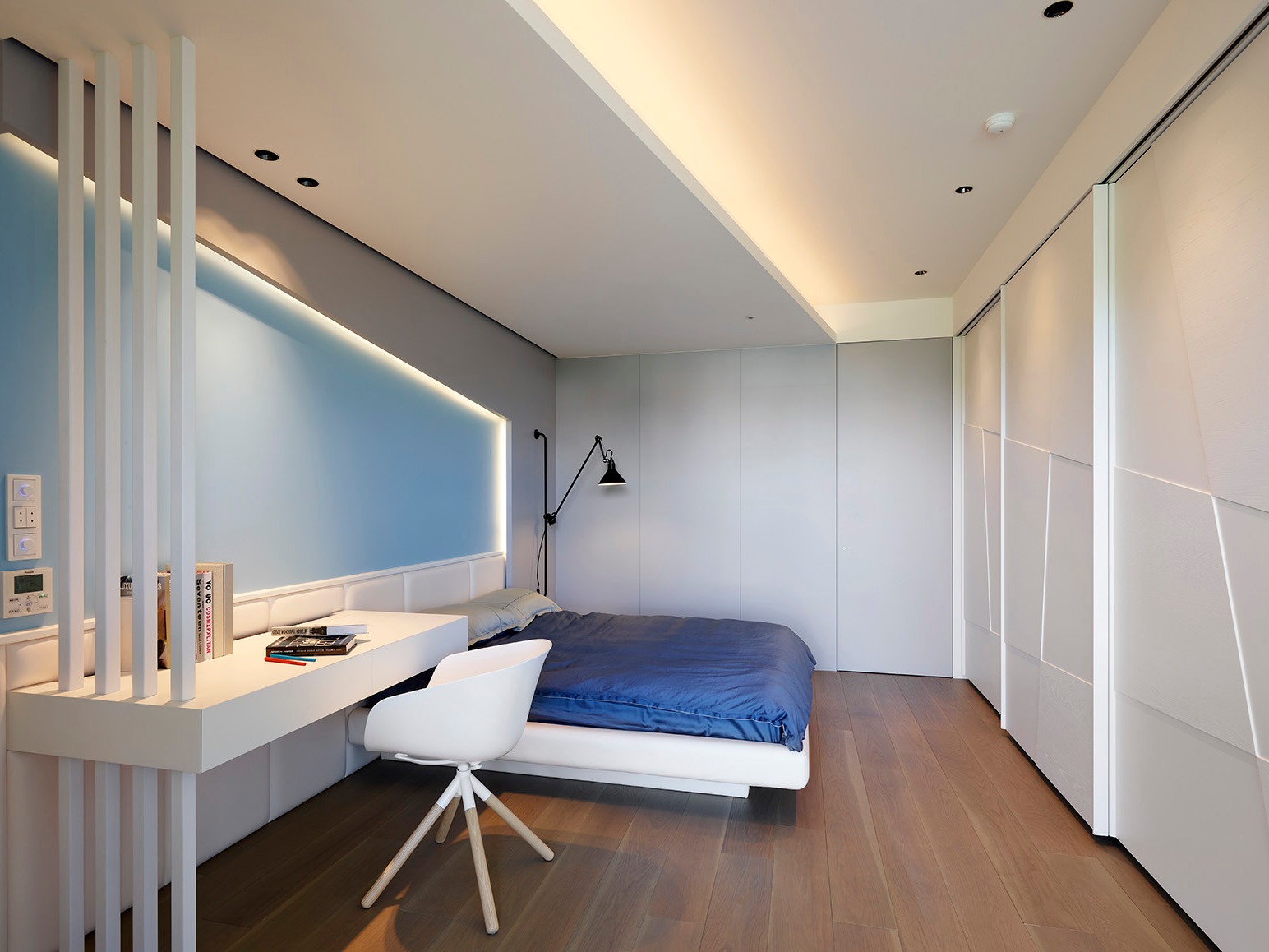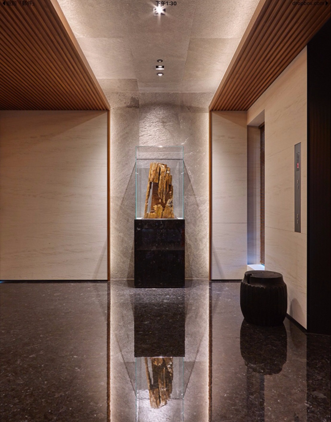 以水波紋的概念規劃出格柵的高低變化,藉由此變化將客廳的大樑消除於無形,也將碧湖的水引入空間.........。