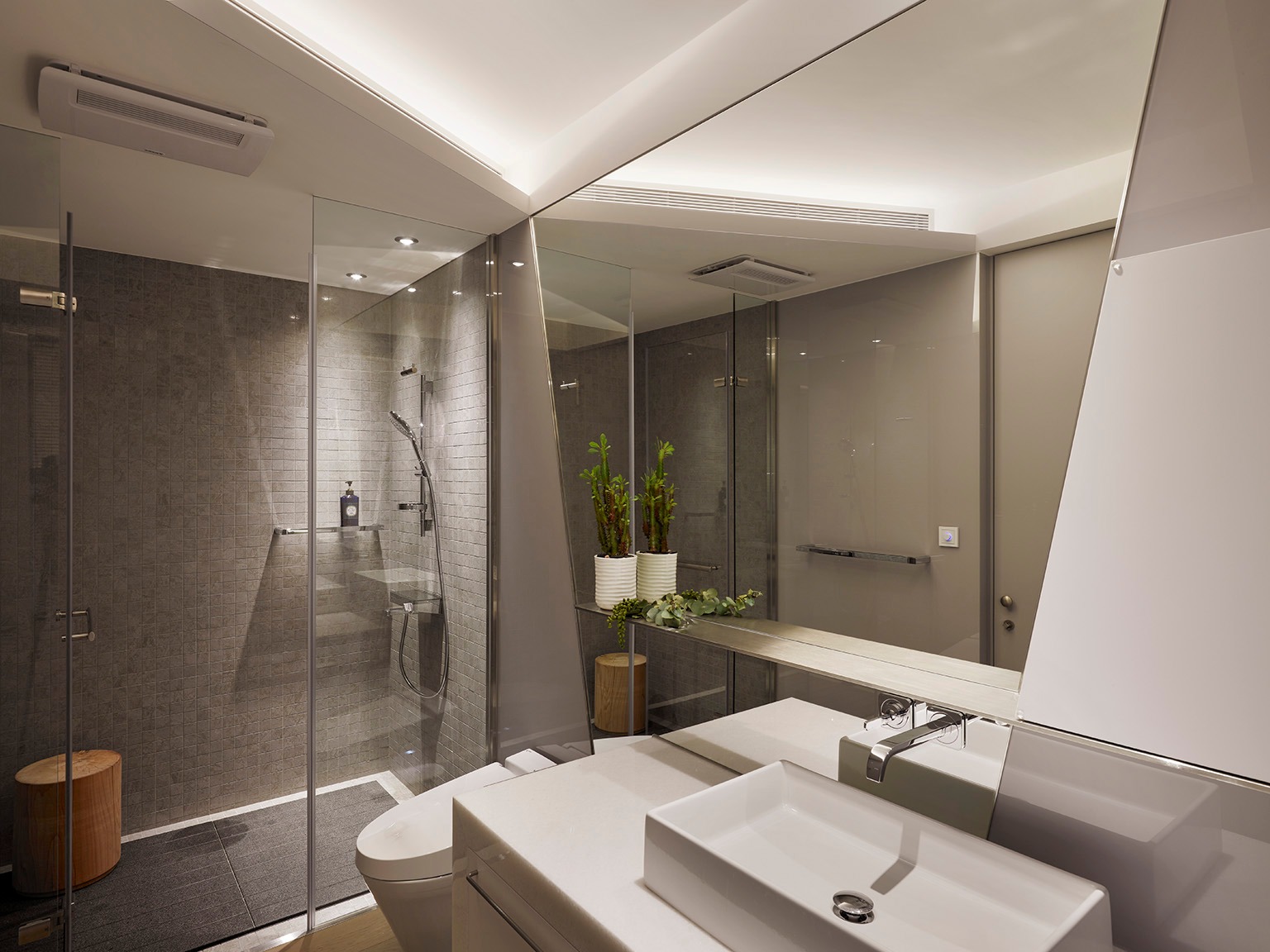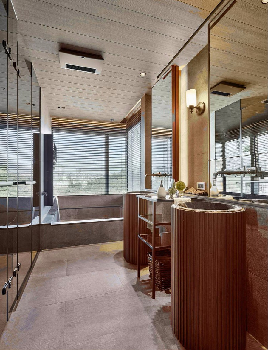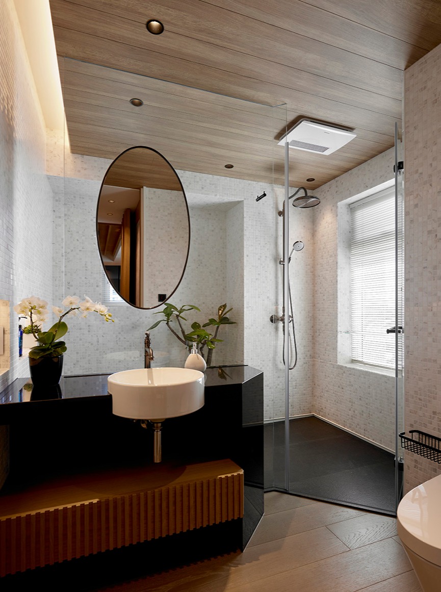 在這間主浴的規劃是以暖灰色系為基底,以防水性強的柚木實木架構了立柱臉盆及降板浴缸的座椅,最特別有趣的是我們在浴缸區將電視、音樂、散熱口、進出水口多項功能化繁為簡的整合在黑色玻璃櫃中。